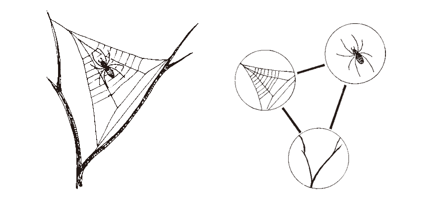 "내 망(web)의 선들은 너네 네트워크의 선들과 전혀 같지 않아. 너네 세계에선 일이 일어나도록 함께 모아지거(brought together)나 배치되는(assembled) 여러가지 쪼가리나 조각이 있을 뿐이야. 그렇다면 네트워크의 모든 '관계(relation)'는 이것과 저것 간(between)의 연결(connection)인 거지. 그렇게 보면, 관계에는 물질적 현존(material presence)는 없는 거지.